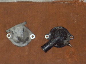 NS400Rのラジエターの取り出しは3気筒と言う事も有り、また、設計された年代の影響も有ってか、非常に特殊で、ラジエターのサイズアップを阻む大きな要因でした。しかし、常々サイズアップを目論んでいたある日、オークションに出ていたパーツに目が止まりました。写真の部品ですが、NSのラジエター取り付け部(左側)と非常によく似たパーツですね。それはNSとほぼ同年代に誕生していたVF750F(d)の物でした。これで、一気に加工への意欲が沸きました。(^^ゞちなみに新品が出るかどうか分かりませんが、部番は(19315-MB2-000サーモスタットカバー)Oリングもサイズが違いますので(91307-MB0-003)です。 |