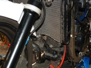フレーム左側のラジエターホースの取り回しです。