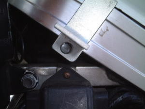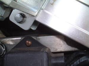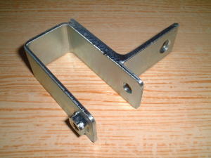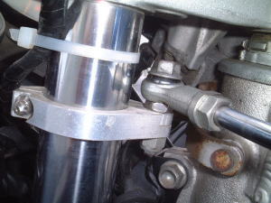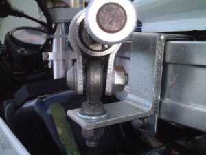 | ハンドルのブレを押さえたくて、ステダンの取り付けを検討しました。しかし、オークションなどで、ステダンのキットが出ても高値で取引されており、私には手が出ませんでした。そこで、ブラケットを自作する事にしたのです。フレーム側は、自作のブラケットとして、フロントフォーク側は汎用の41mmのmの物を使う事にしました。 |