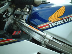 | 取り付け後のインプレですが、これがなかなかイイ感じです。(^o^)ギャップに乗った時のバイクの挙動がとにかく安定しています。特にバイクの動きが気になるコーナーリング中のギャップはあんまり気にせずに突っ込める様になりました。これは特筆物です。もちろん、普通の道でも、ありがちな車のタイヤのワダチにも足下をすくわれる様な感覚が減りました。おかげで、安心して走る事が出来る様になりました。これは、見た目と共に、機能的にもかなりの効果が得られる事が判りました。ということで、お奨めの改造です。 |
